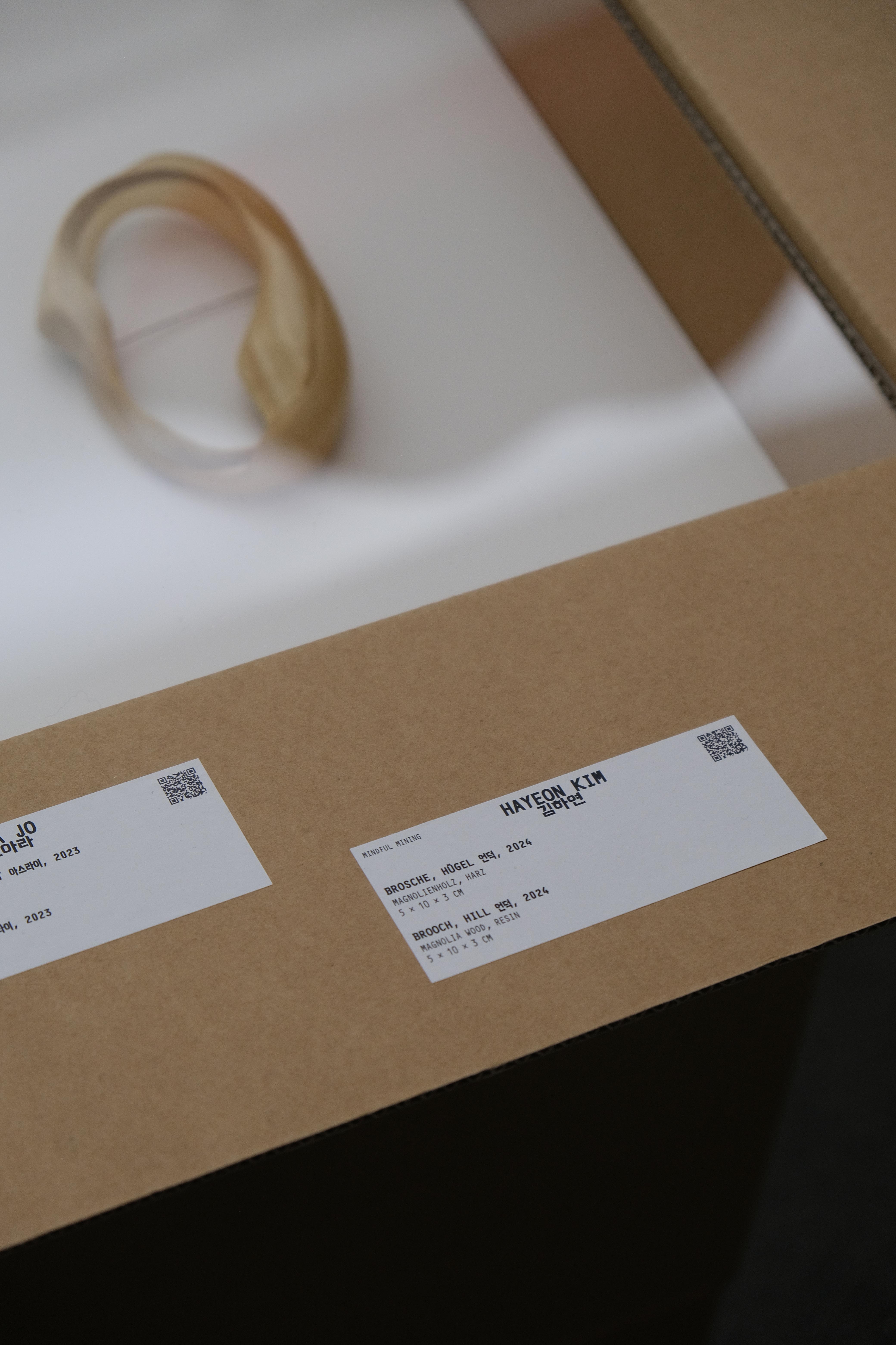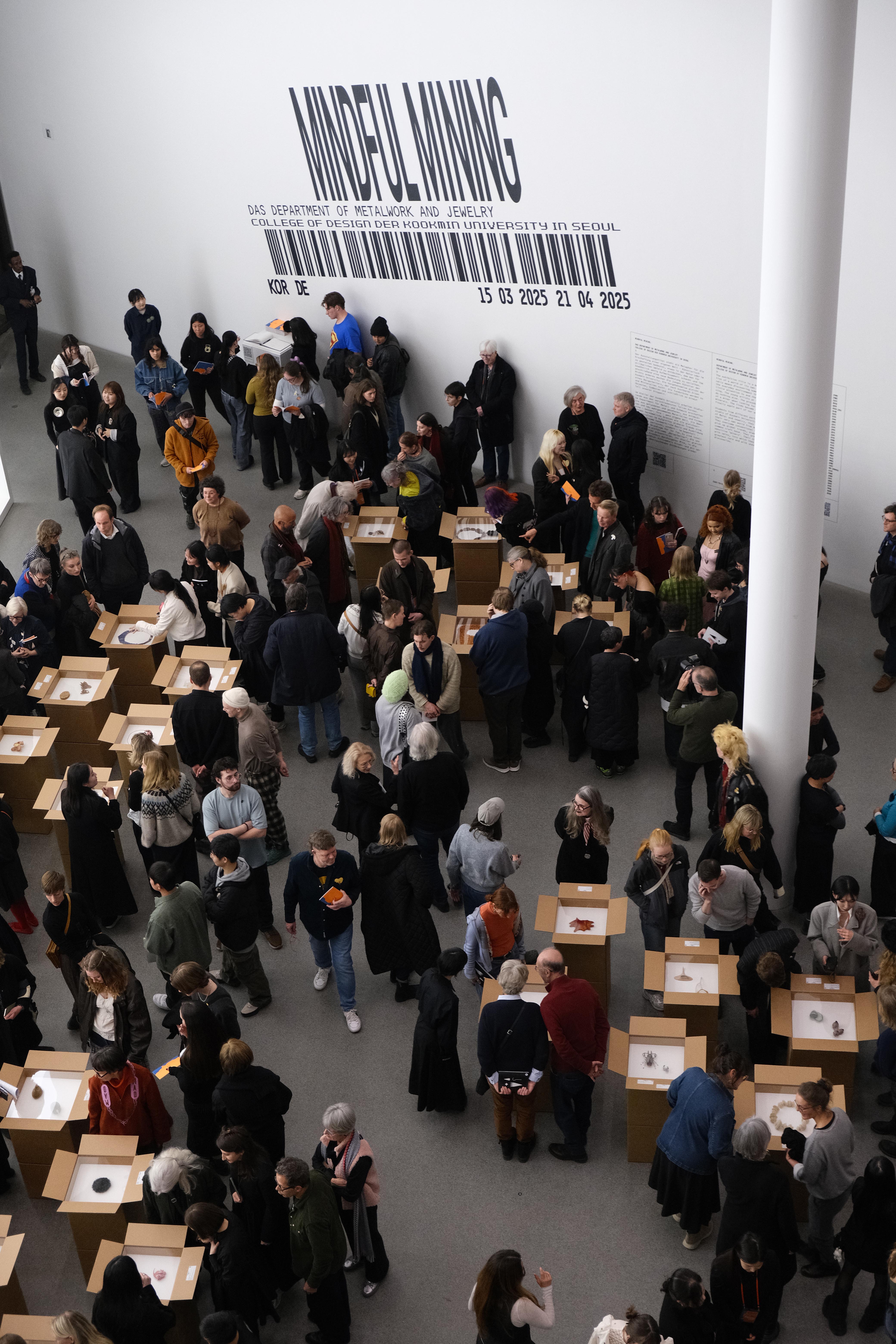 For the exhibition “MINDFUL MINING. The Department of Metalwork and Jewellery. College of Design of Kookmin University in Seoul”, the typography reflects the journey of the jewellery from Seoul to Munich, as well as its presentation in shipping boxes.